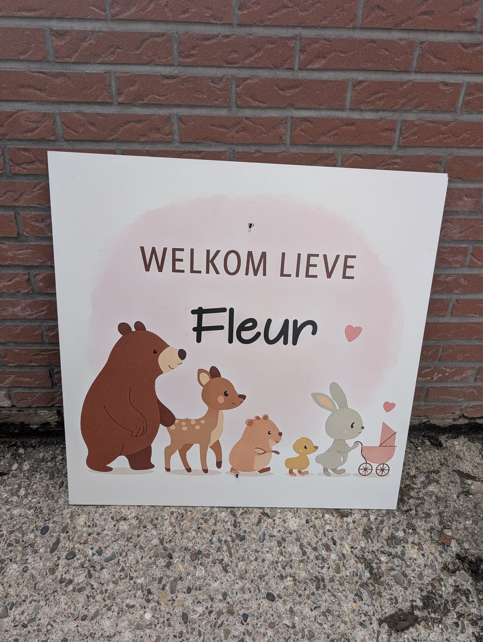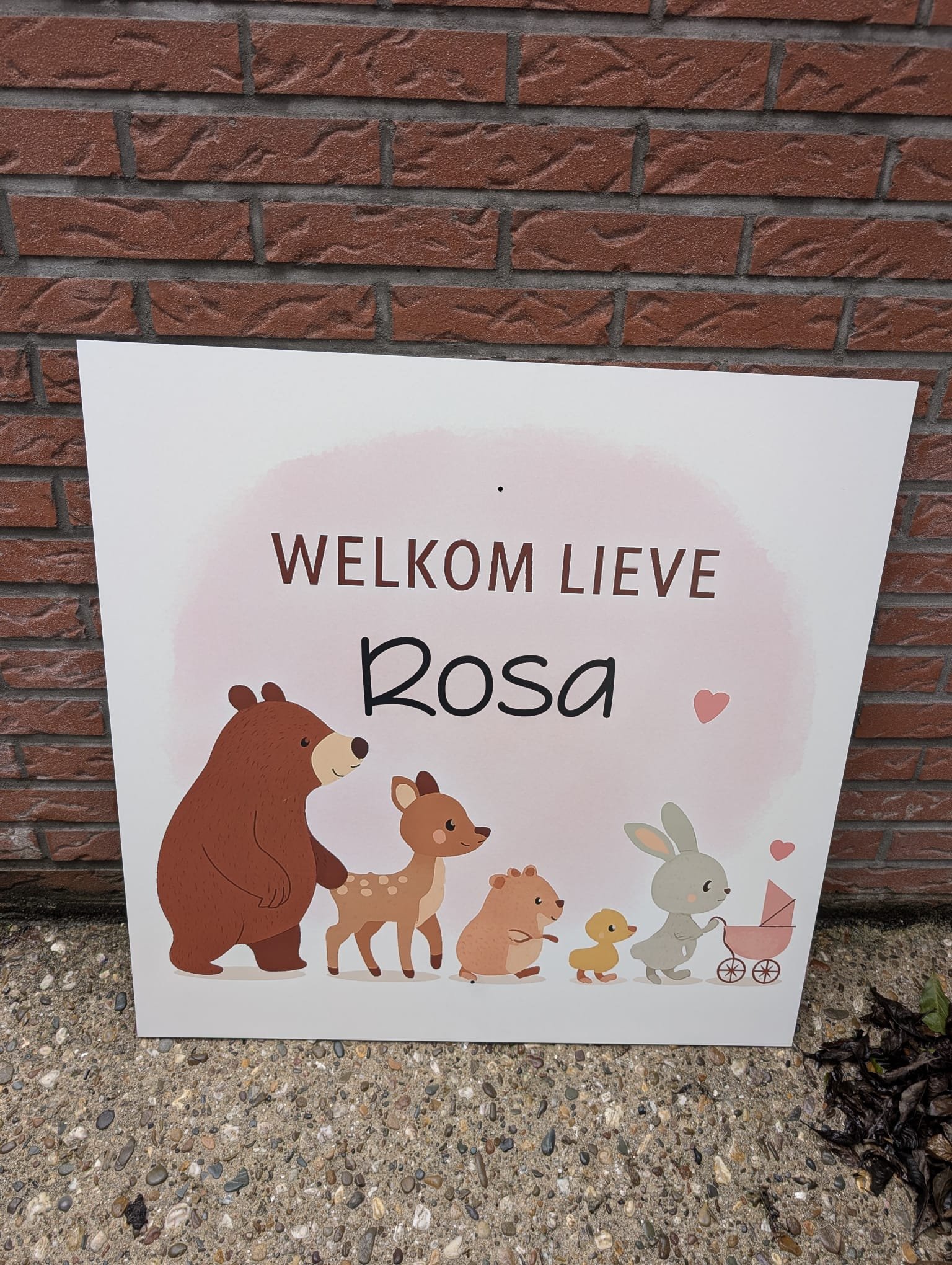 Laat iedereen weten dat er een kleintje is geboren met dit lieve geboortebord vol wandelende dieren en een roze hartje van geluk!