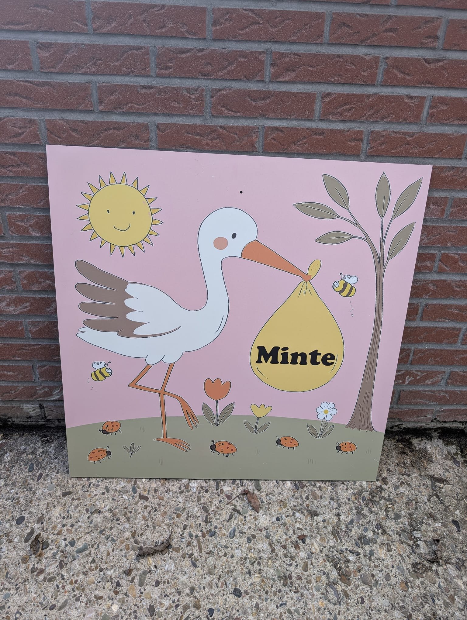 Of je nu een trotse buurvrouw, vriendin of collega bent—dit geboortebord is een warme verrassing voor de ouders. De ooievaar, het vrolijke landschap en de roze zonnestraal zorgen voor een liefdevolle sfeer in de tuin. Een feestelijke aankondiging én een blijvende herinnering aan een bijzonder moment.