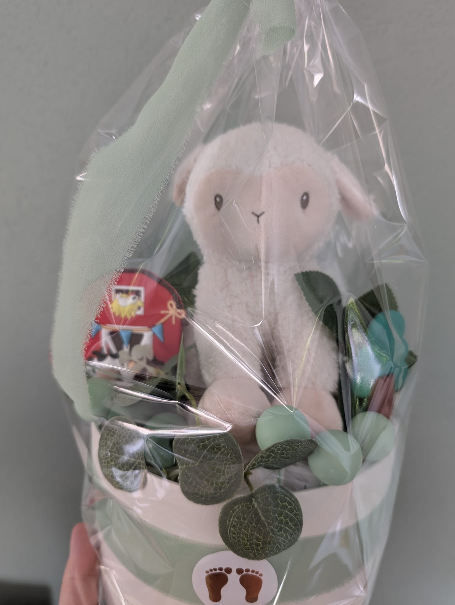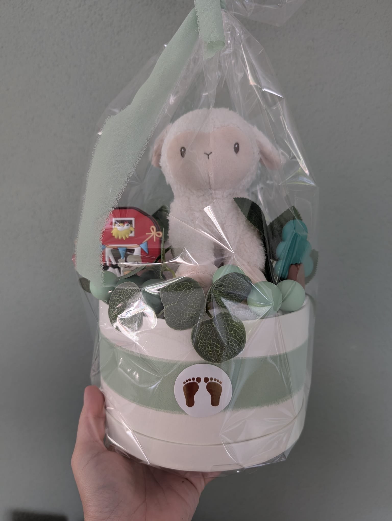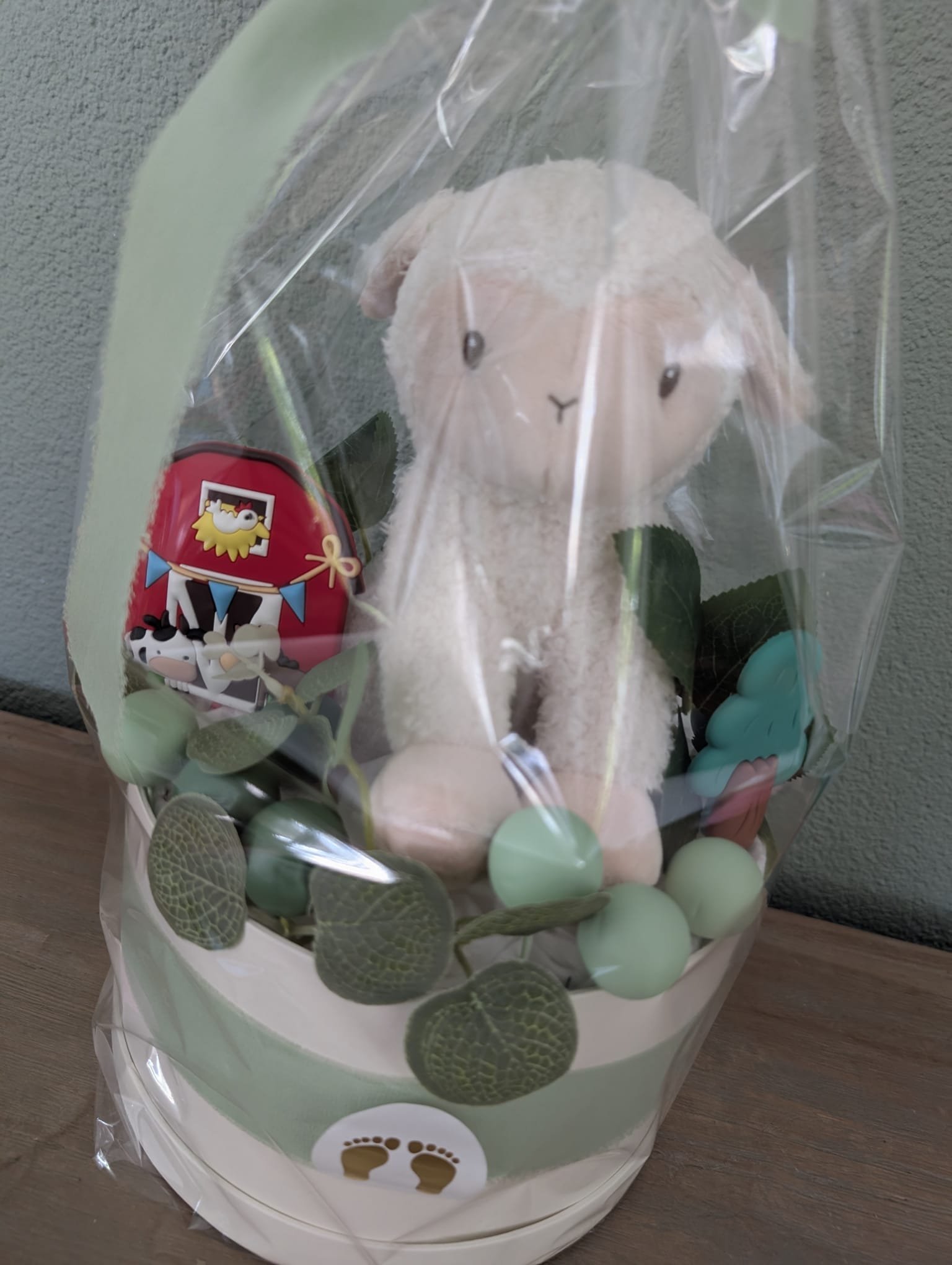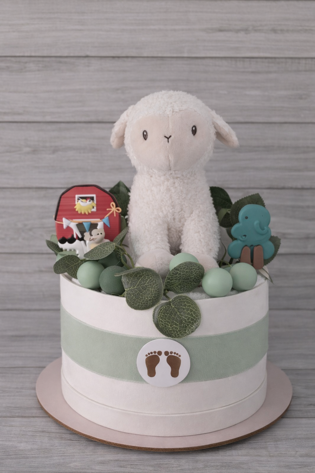De Luiertaart – Boerderijthema met Little Dutch Schaapje is een stijlvol en schattig kraamcadeau, ideaal voor kleine dierenvriendjes. Deze handgemaakte luiertaart combineert neutrale kleuren met een speels accent en past perfect in iedere babykamer.