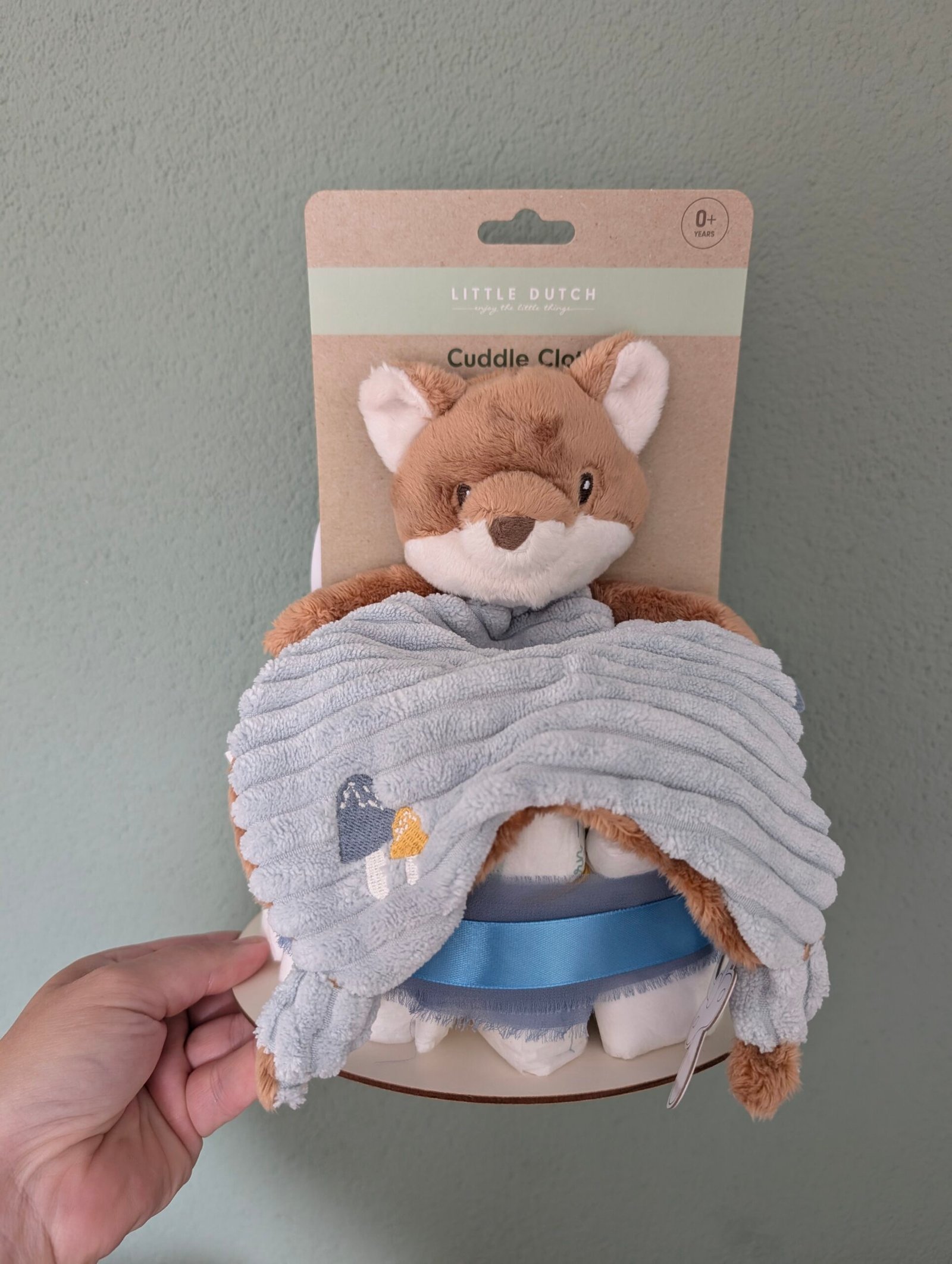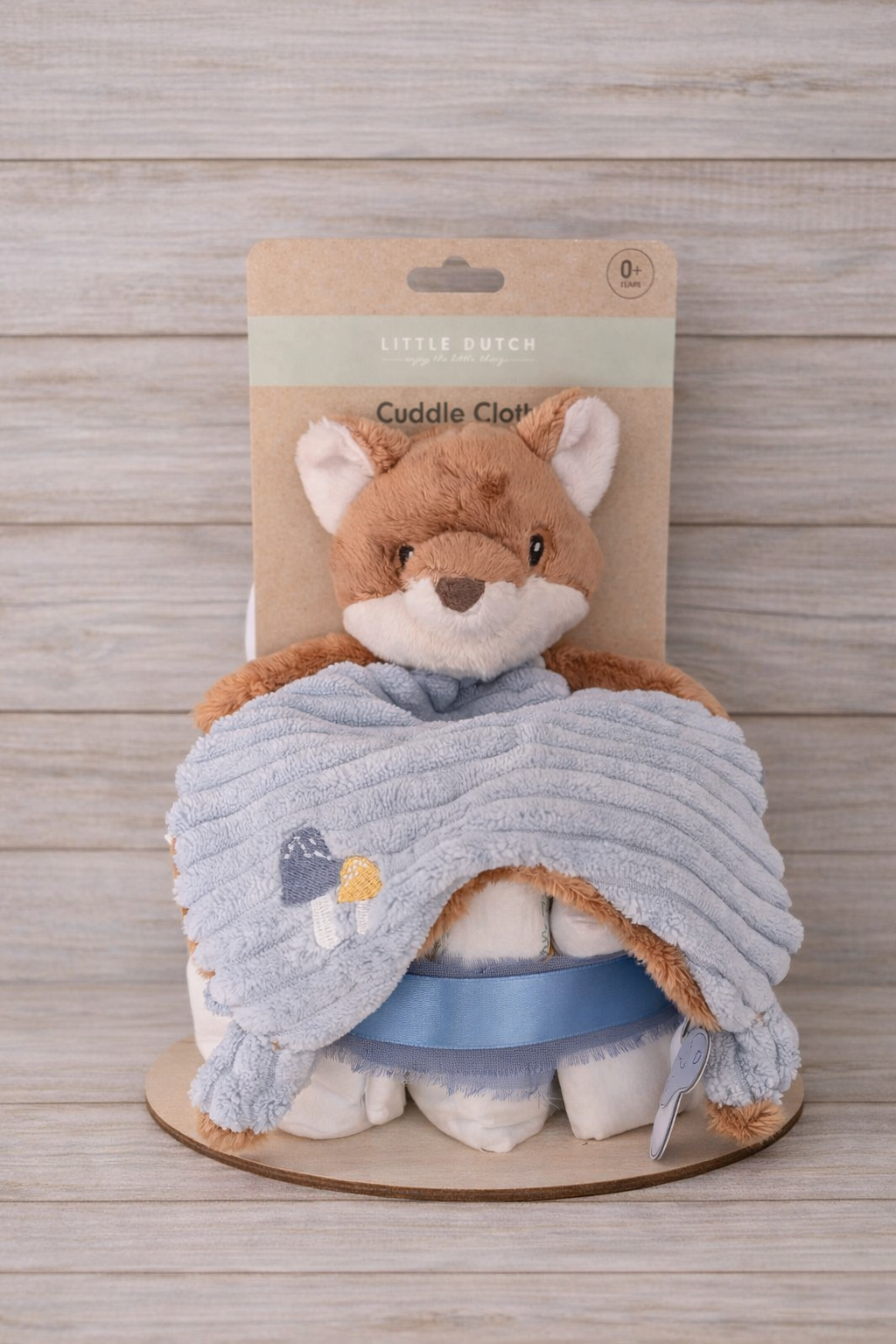 Op een stevig houten plateau liggen 9 zachte luiers, netjes opgerold en zorgvuldig gestyled. In het midden staat het zachte Little Dutch knuffeldoekje Vos uit de Forest Friends-collectie. Dit troostende doekje is ideaal voor pasgeboren baby’s.