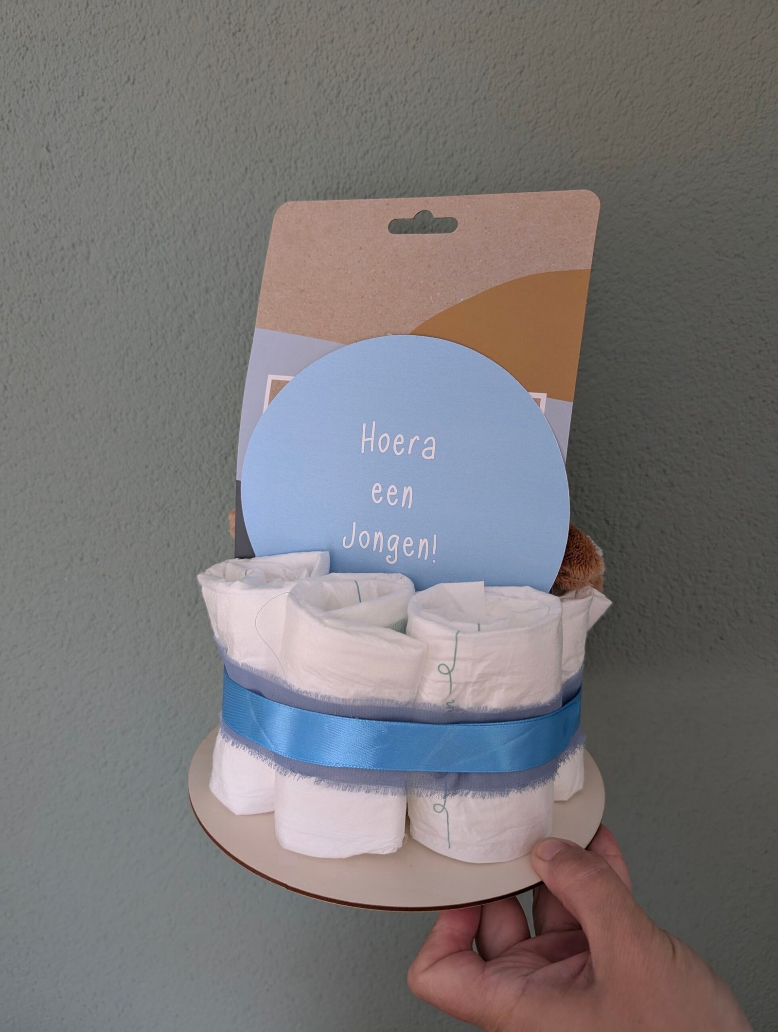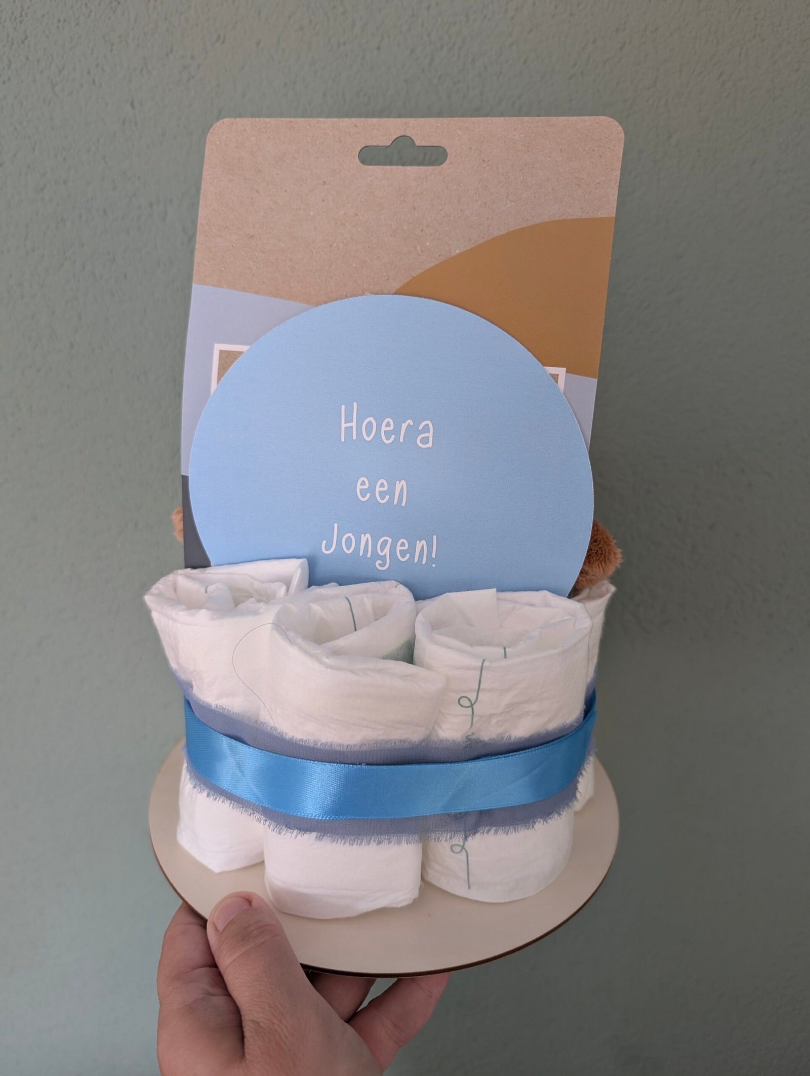 Achterop de luiertaart is een feestelijke kaart bevestigd met de tekst “Hoera een jongen”, waardoor het cadeau direct compleet is. De combinatie van natuurlijke materialen, warme kleuren en praktische inhoud maakt deze luiertaart geliefd bij ouders en geschikt als decoratie in de babykamer.