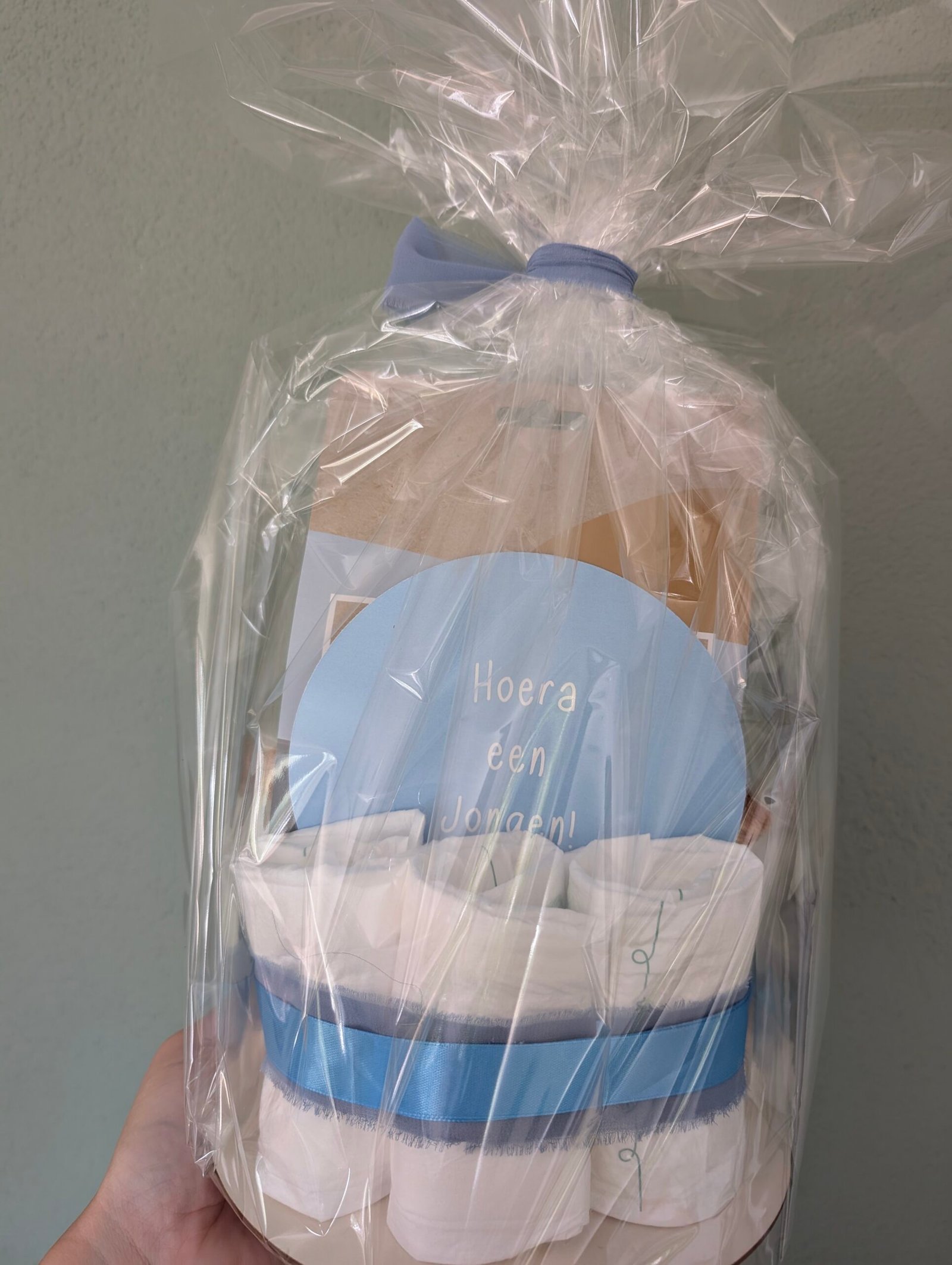 Het geheel is netjes ingepakt in transparante folie en daardoor direct cadeau-klaar. Dankzij het compacte formaat is de luiertaart makkelijk mee te nemen, maar behoudt hij een luxe uitstraling.