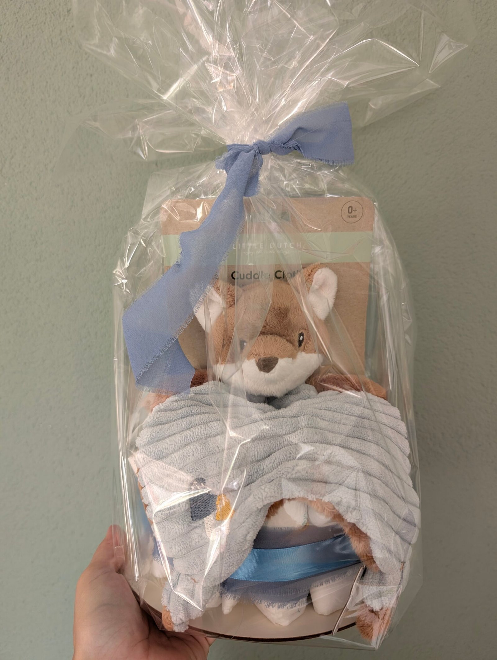De Luiertaart Forest Friends Vos knuffeldoekje is een stijlvol en compact kraamcadeau, perfect voor de geboorte van een jongen. Het handgemaakte cadeau combineert praktische babyproducten met een luxe presentatie.