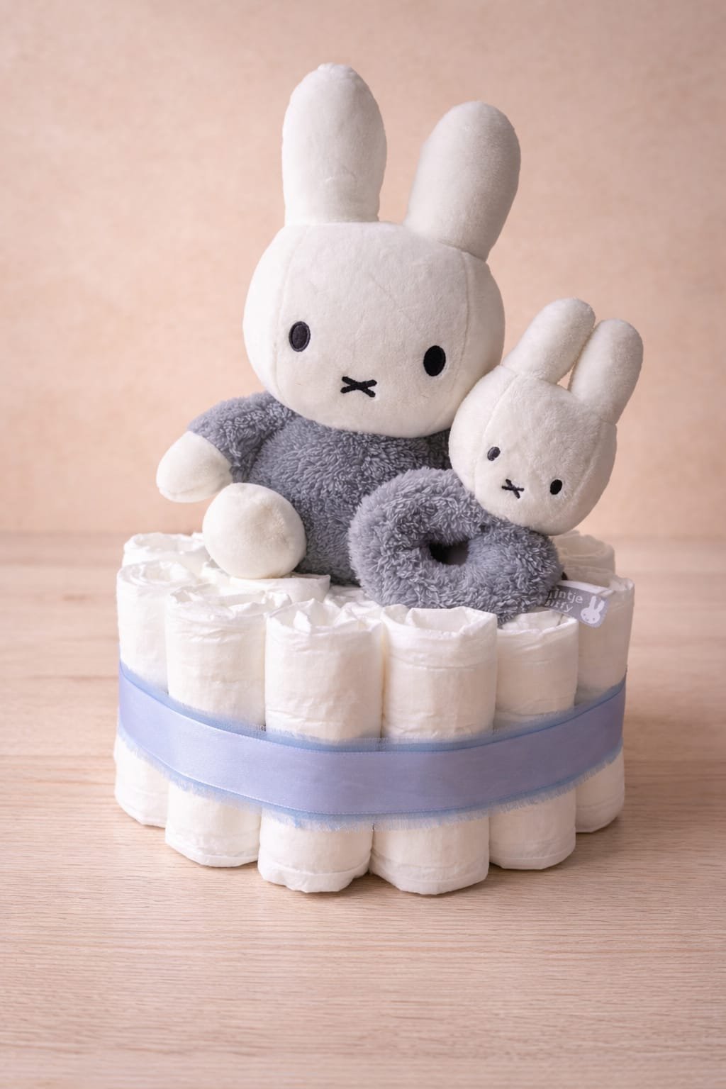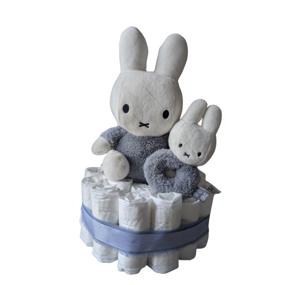 De Luiertaart Nijntje knuffel en rammelaar blauw is een stijlvol handgemaakt kraamcadeau met een zachte en luxe uitstraling. Perfect voor een geboorte, babyshower of kraamfeest.