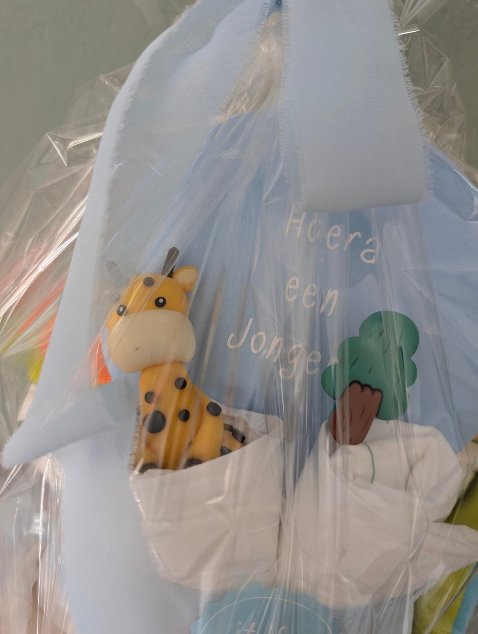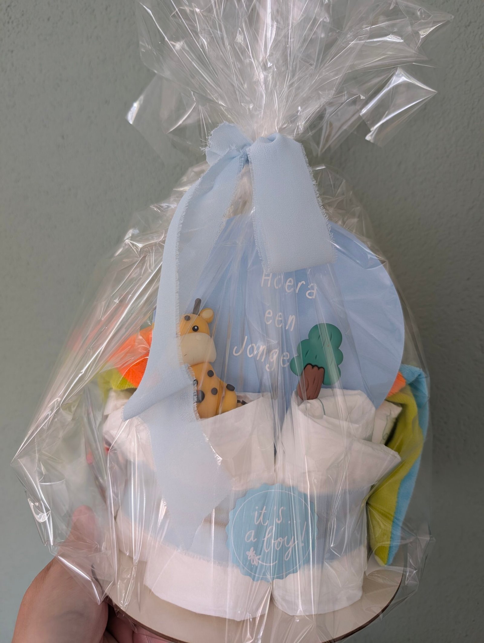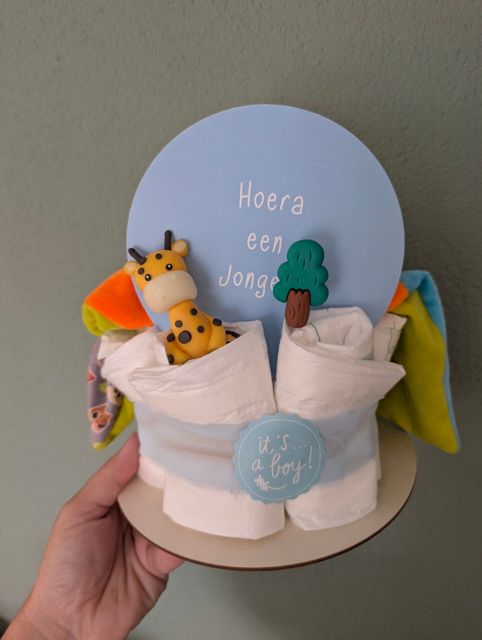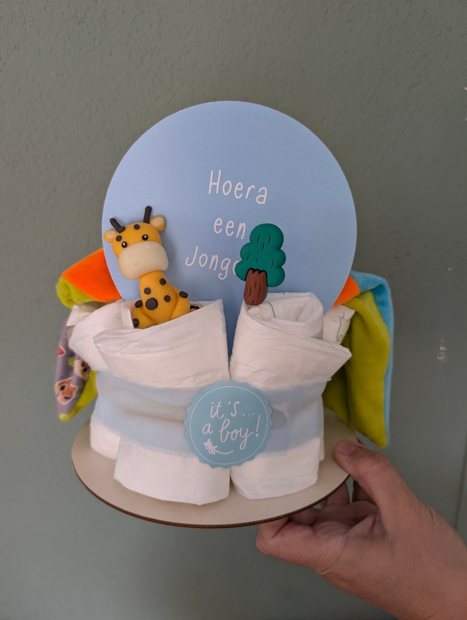 Achterop de luiertaart staat een feestelijke kaart met de tekst “Hoera een jongen”. Een kleine giraffe en een boompje maken het geheel compleet en geven de luiertaart een speelse, natuurlijke uitstraling. Dankzij het compacte formaat is dit cadeau makkelijk mee te nemen en behoudt het een luxe uitstraling.