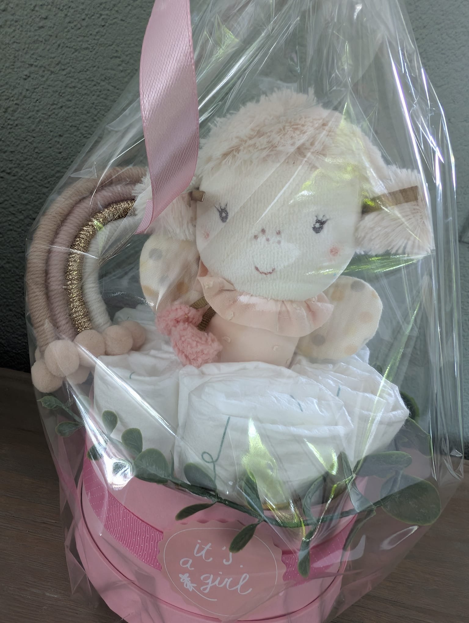 De Mini Luiertaart Roze Rammelaar Fee is een compact en stijlvol kraamcadeau, ideaal voor een pasgeboren meisje. Handgemaakt en zorgvuldig samengesteld, combineert dit cadeau praktische luiers met een zacht, speels speeltje.